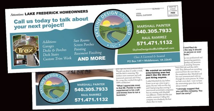 Our graphic artists designed a marketing postcard to showcase Skyline Design and Build out of Middletown, VA. Home improvement is always a good idea, and you can’t go wrong with