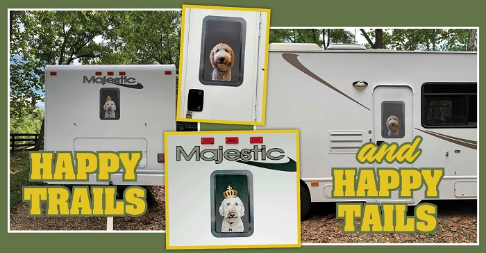 Majestic, the model name of the RV, was emblazoned across the back, so I placed a crown on Bayley’s head to play on that theme. I am so pleased with the printing that National Media Services did. We can’t wait to get the RV on the road to show off our doggies.